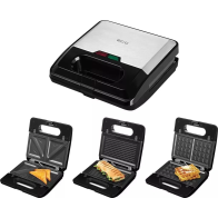 Toustovač - 3v1, s vyjímatelnými plotýnkami, na 2 tousty, trojúhelníkové plotýnky, s nepřilnavým povrchem, součástí balení plotýnky vhodné na vafle, na grilování, rozměry plotýnky 22 × 13 cm (Š×H), uzamykatelný, příkon 750 W, nerezový plášť, černá a stříbrná barva, rozměry 10 × 24 × 23 cm (V׊×H)