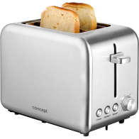 Topinkovač - na 2 topinky, regulace opékání, rozmrazování, centrování, světelná signalizace a rozpékač, součástí vyjímatelná miska na drobky a nástavec na rozpékání pečiva, příkon 800 W, materiál nerez, barva stříbrná