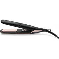 Žehlička na vlasy - keramický povrch destiček, rozsah teploty od 80 do 220 °C, rychlonahřívání, automatické vypnutí, plovoucí žehlící desky, regulace teploty, světelná signalizace, vhodná i pro tvorbu vln, bez displeje, příkon 43 W, délka přívodního kabelu 1,65 m, šedá barva, bezpečnostní zámek, flexibilní kabel a plovoucí žehlicí desky, síťové napájení