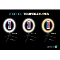 Univerzální kruhové RGB LED světlo Connect IT je vybaveno speciálním držákem telefonu, díky kterému můžete pořizovat selfie fotky, streamovat nebo třeba nahrávat vlog. Světlo je vybaveno kvalitním stativem s kulovou hlavou, takže ho můžete snadno otáčet a díky ovládání na přívodním USB kabelu si snadno nastavíte barvu nebo si zvolíte jeden z devíti dynamických efektů svícení.